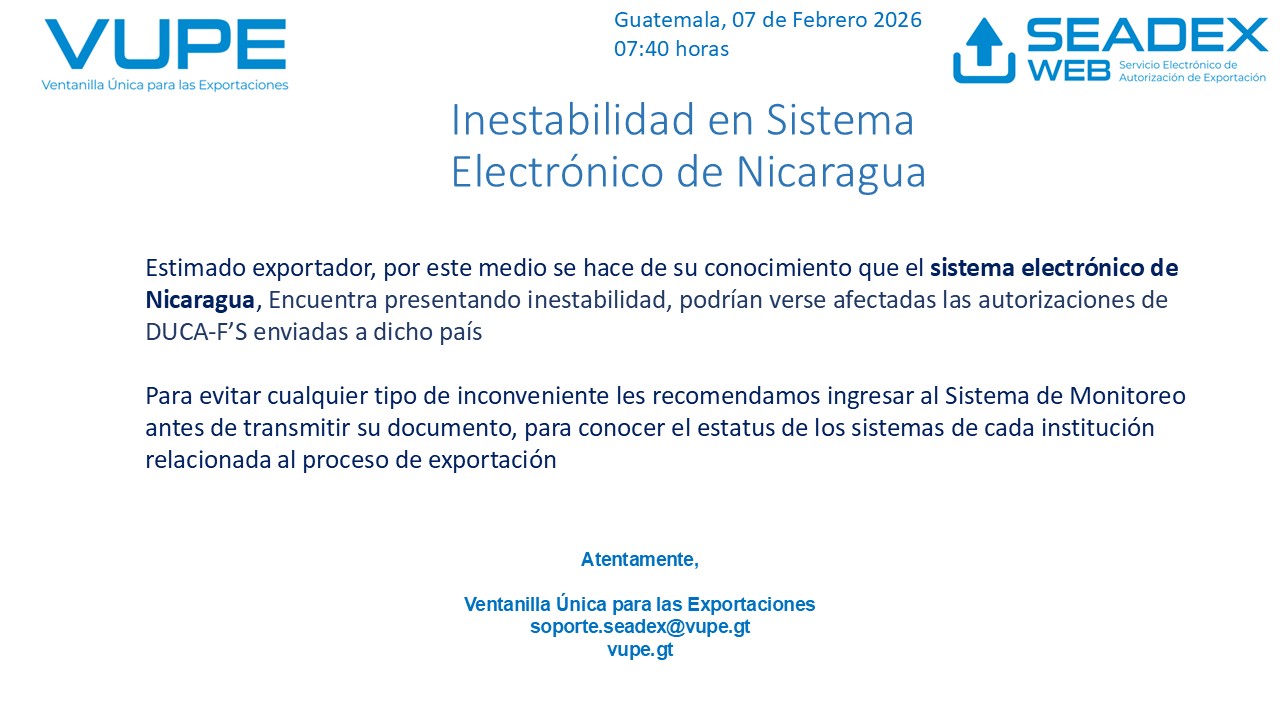 NOTA 1: En caso de presentar problemas para ingresar al modulo de e-Docs, esto se debe a que su Código de Exportador no se encuentra en estado “FINALIZADO”. Para cambiar de estado puede escribir al correo de soporte.seadex@vupe.gt adjuntando la imagen el la cual muestra un estado diferente y solicitando al equipo de Soporte el cambio de estado.
