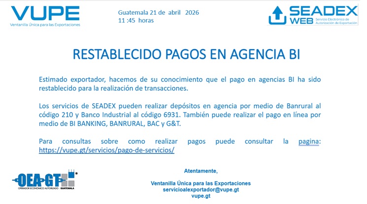 - El segundo paso es anular el DUCA F o DUCA D ante SAT, por medio de un escrito mediante el cual solicite la anulación/cambio de estado de este documento, adjuntando documentos de soporte para la solicitud y la constancia de anulación del documento emitido por VUPE, este se emite al momento de ya poseer el documento anulado en la plataforma SEADEX WEB, en la pestaña Constancia/VUPE; toda esta documentación la ingresa en la 7 avenida y 4 calle zona 9 Torre SAT 1 nivel en la ventanilla de asuntos aduanales.