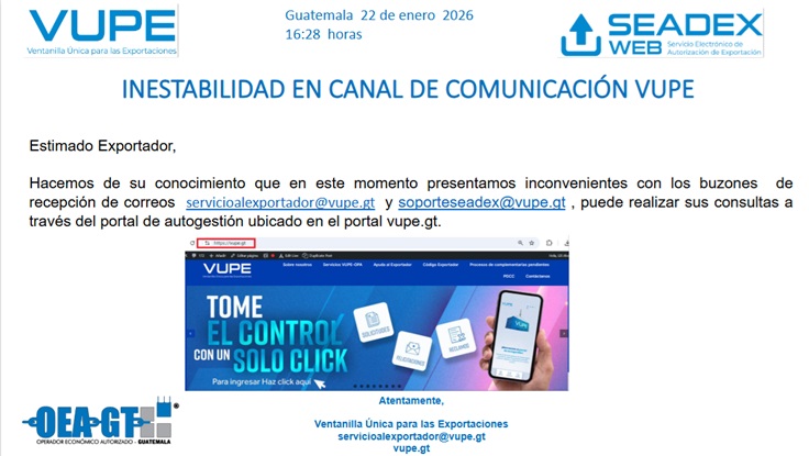 Hacemos de su conocimiento que en este momento presentamos inconvenientes con los buzones de recepción de correos servicioalexportador@vupe.gt y soporteseadex@vupe.gt , puede realizar sus consultas a través del portal de autogestión ubicado en el portal vupe.gt.