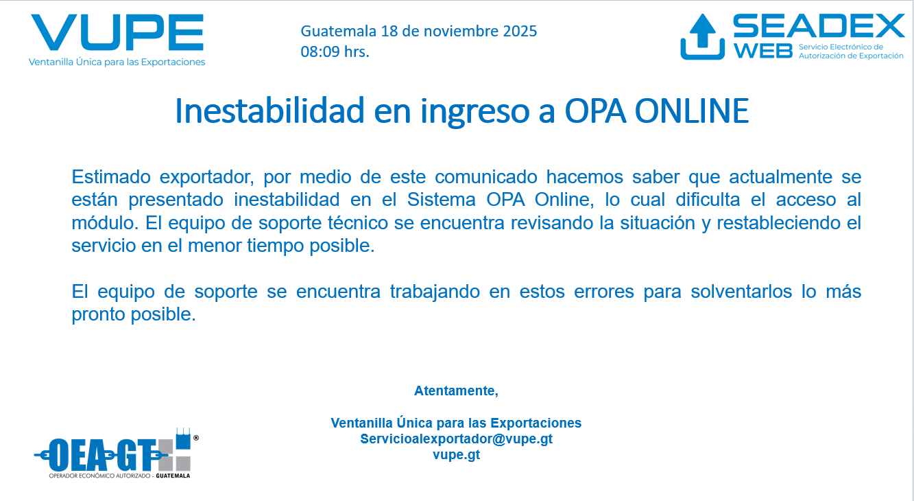 Estimado exportador, por medio de este comunicado hacemos saber que actualmente se están presentado inestabilidad en el Sistema OPA Online, lo cual dificulta el acceso al módulo. El equipo de soporte técnico se encuentra revisando la situación y restableciendo el servicio en el menor tiempo posible.