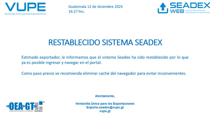 Estimado exportador, por este medio se hace de su conocimiento que el sistema electrónico de El Salvador, se encuentra presentando inestabilidad, podrían verse afectadas [...]