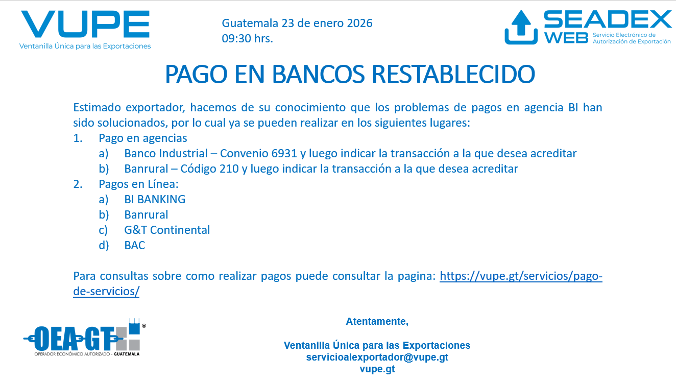 Estimado exportador, hacemos de su conocimiento que los problemas de pagos en agencia BI han sido solucionados, por lo cual ya se pueden realizar en los siguientes lugares: