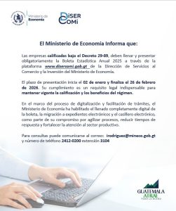 Para este año 2026, la presentación de este requisito legal indispensable para mantener vigente la calificación y los beneficios del régimen es por medio de la plataforma www.disercomi.gob.gt, correspondiente directamente al Ministerio de Economía de Guatemala.