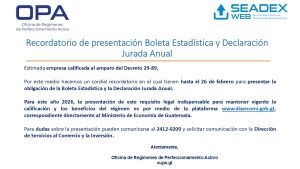 Por este medio hacemos un cordial recordatorio en el cual tienen hasta el 26 de febrero para presentar la obligación de la Boleta Estadística y la Declaración Jurada Anual.