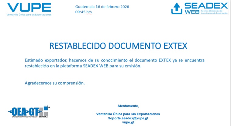 Estimado exportador, hacemos de su conocimiento el documento EXTEX ya se encuentra restablecido en la plataforma SEADEX WEB para su emisión. Agradecemos su comprensión. [...]