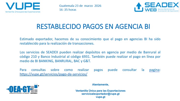 Los servicios de SEADEX pueden realizar depósitos en agencia por medio de Banrural al código 210 y Banco Industrial al código 6931. También puede realizar el pago en línea por medio de BI BANKING, BANRURAL, BAC y G&T.