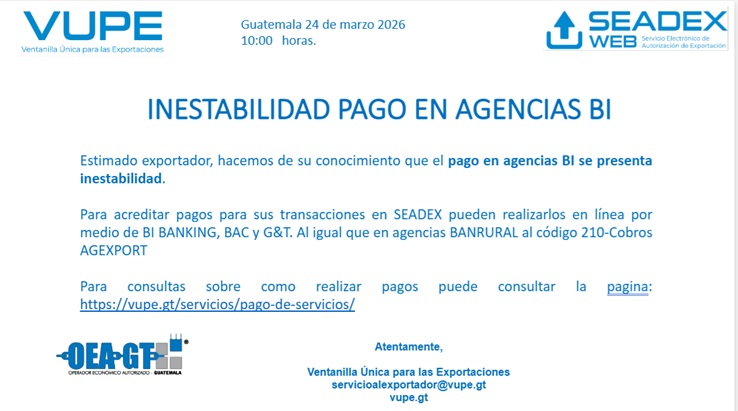 Estimado exportador, hacemos de su conocimiento que el pago en agencias BI se presenta inestabilidad. Para acreditar pagos para sus transacciones en SEADEX [...]