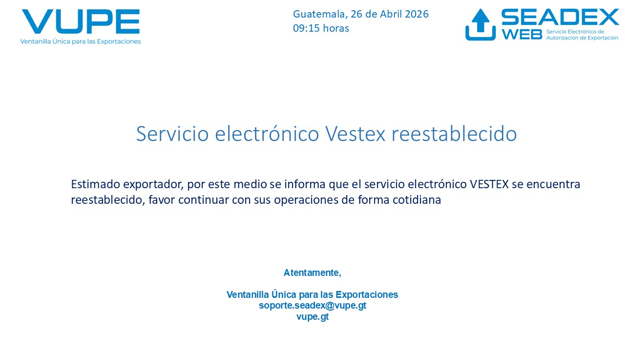 Estimado exportador, por este medio se hace de su conocimiento que el sistema electrónico presenta inestabilidad, por lo cual podrían verse afectadas las autorizaciones [...]