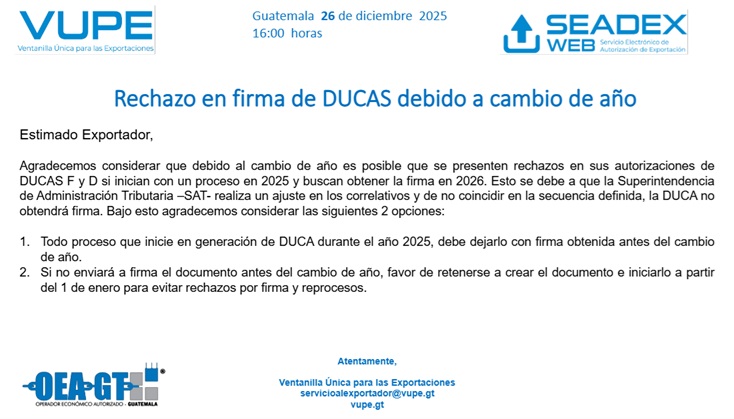 Estimado Exportador, Agradecemos considerar que debido al cambio de año es posible que se presenten rechazos en sus autorizaciones de DUCAS F [...]