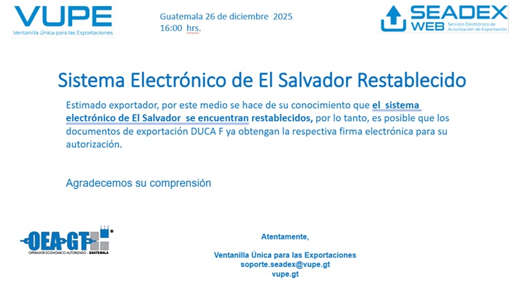 Estimado exportador, por este medio se hace de su conocimiento que el sistema electrónico de El Salvador se encuentran restablecidos, por lo tanto, es posible que los documentos de exportación DUCA F ya obtengan la respectiva firma electrónica para su autorización.