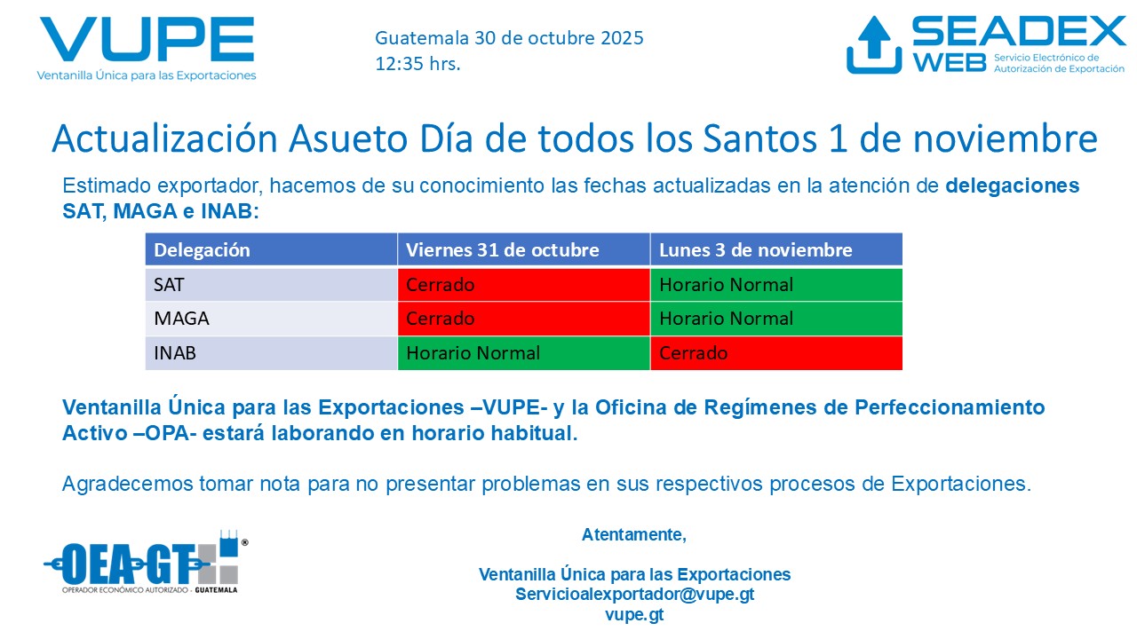 Estimado exportador, hacemos de su conocimiento las fechas actualizadas en la atención de delegaciones SAT, MAGA e INAB: Delegación Viernes 31 de octubre Lunes [...]