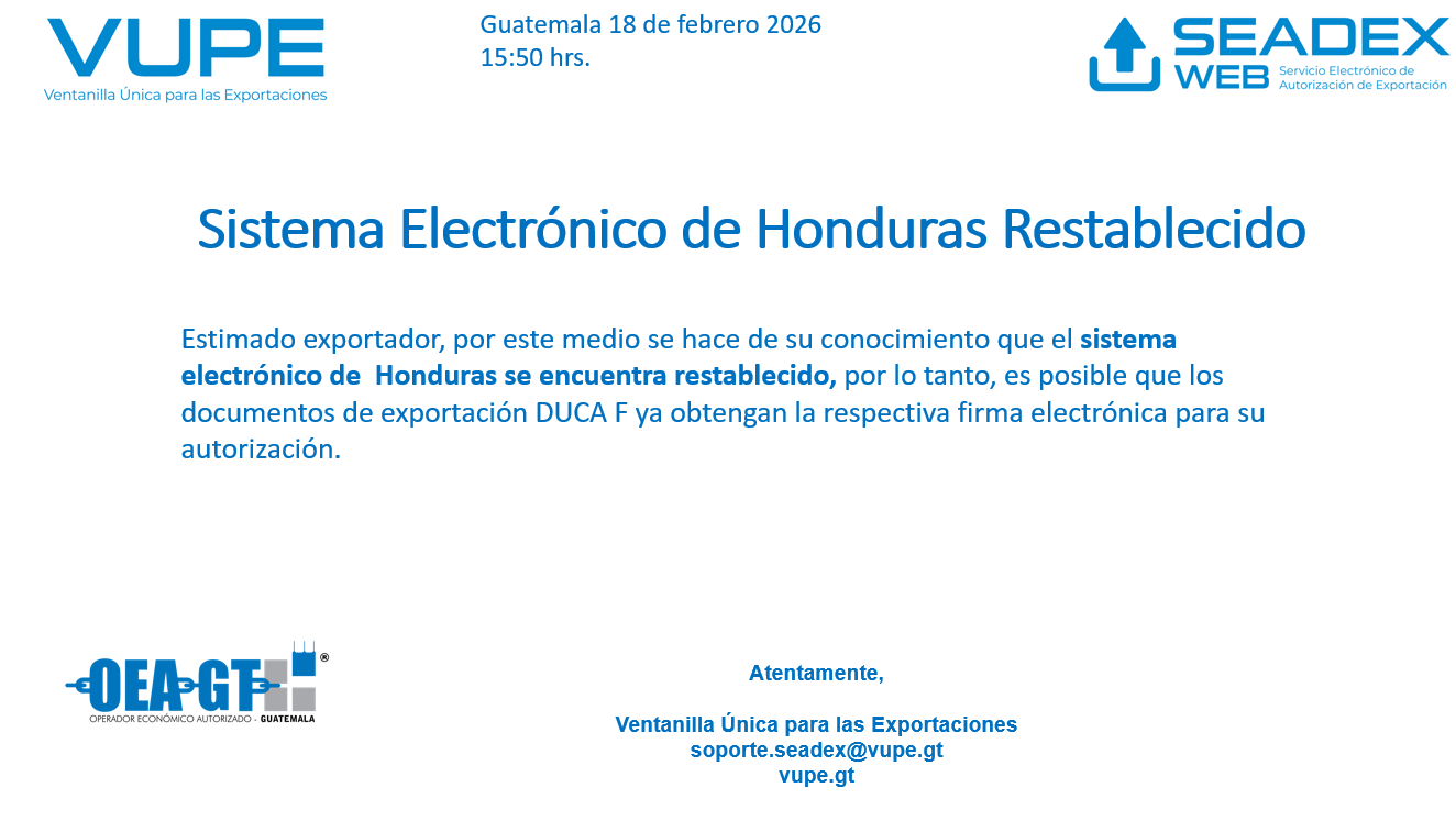 Estimado exportador, por este medio se hace de su conocimiento que el sistema electrónico de Honduras se encuentra restablecido, por lo tanto, es posible que los documentos de exportación DUCA F ya obtengan la respectiva firma electrónica para su autorización.