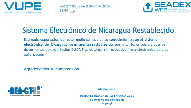 Estimado exportador, por este medio se hace de su conocimiento que el sistema electrónico de Nicaragua se encuentra restablecido, por lo tanto, es posible que los documentos de exportación DUCA F ya obtengan la respectiva firma electrónica para su autorización.