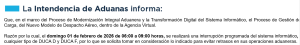 En el marco del Proceso de Modernización Integral Aduanera y la Trasformación Digital del Sistema Informático, el día domingo 1 de febrero de 2026 la Intendencia de Aduanas realizará mejoras en sus sistemas informáticos.