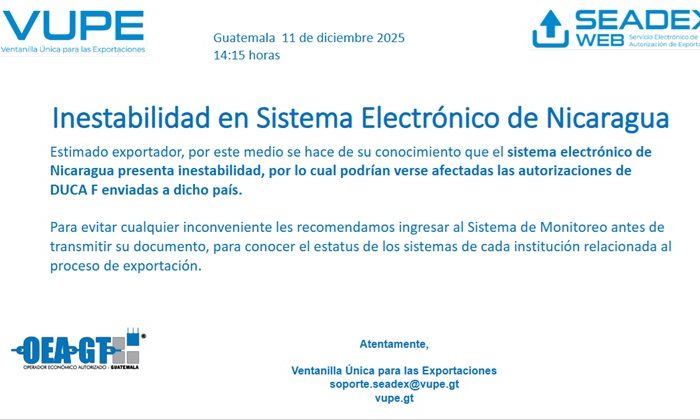Estimado exportador, por este medio se hace de su conocimiento que el sistema electrónico de Nicaragua presenta inestabilidad, por [...]
