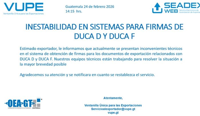 - DUCA Complementaria: Para exportaciones vía marítima o aérea, se emite luego de que el producto se haya exportado y sirve para liquidar la exportación ante la SAT.